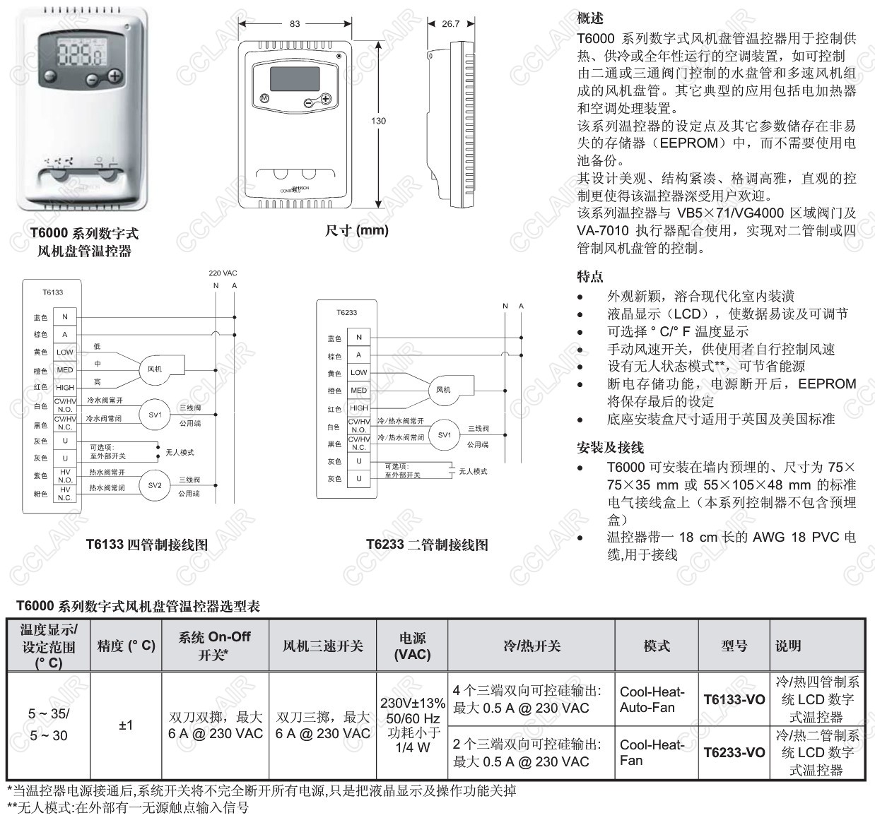 詳細(xì)信息 T6133-VO,T6233-VO,T6000,數(shù)字式風(fēng)機盤管溫控器