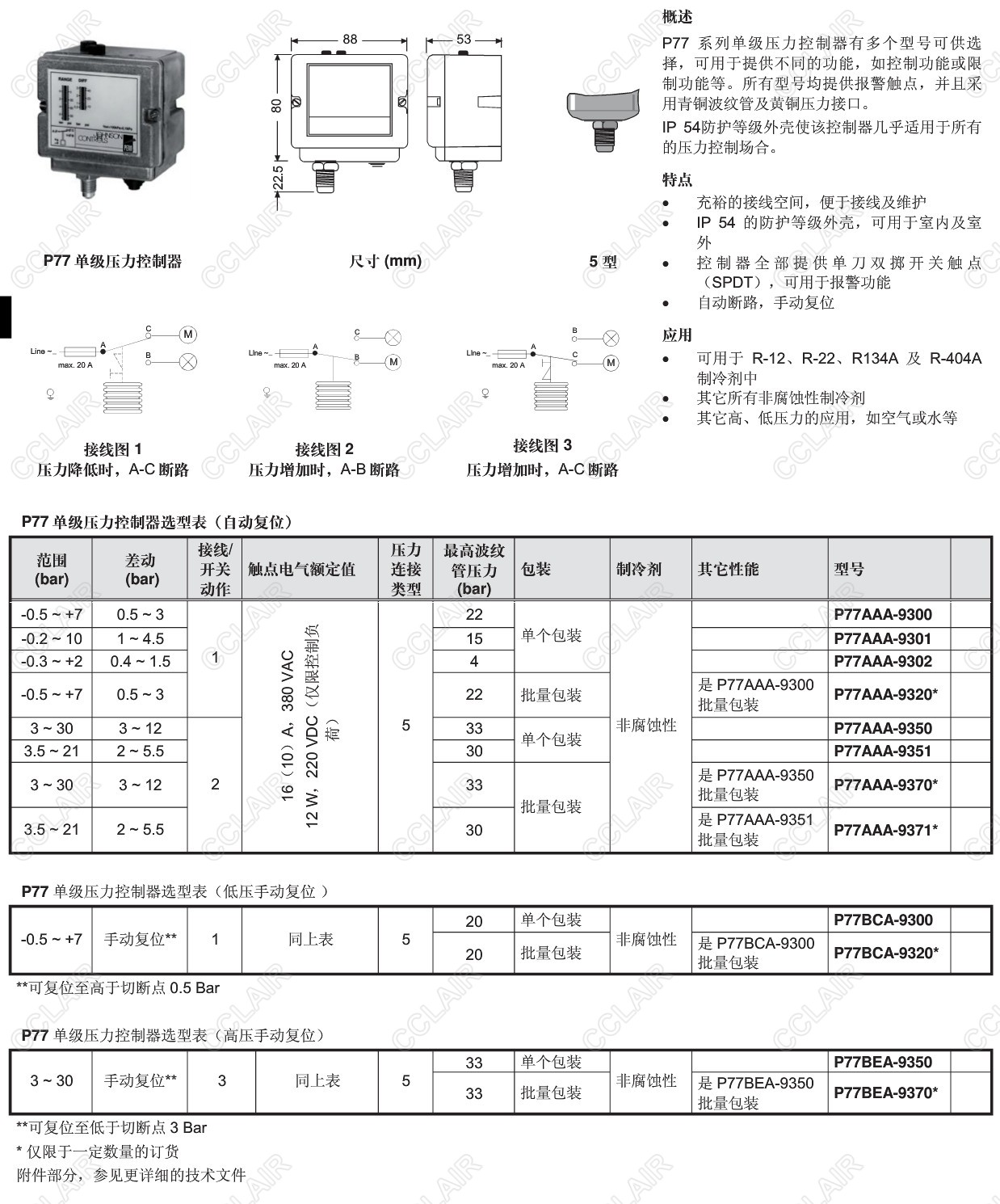 詳細(xì)信息 P77AAA-9300,P77AAA-9301,P77AAA-9302,P77AAA-9320,P77AAA-9350,P77,單級(jí)壓力控制器