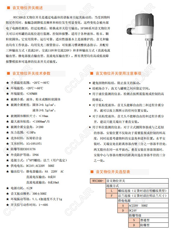 WYC300-LAN,WYC300-LAD,WYC300-LDN,WYC300-LDD,WYC300音叉物位開關