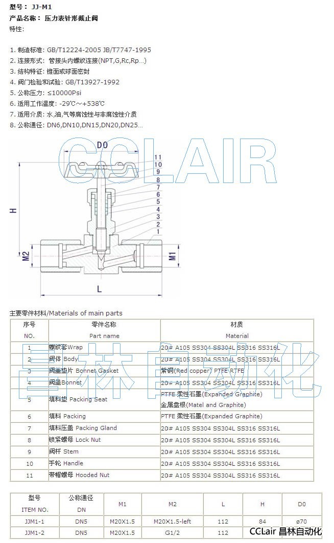JJM1-1,JJM1-2, 壓力表針形截止閥