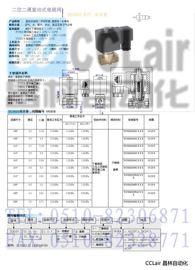 YCSM3105A3,YCSM31061,YCSM31062,YCSM31063,二位二通直動式電磁閥
