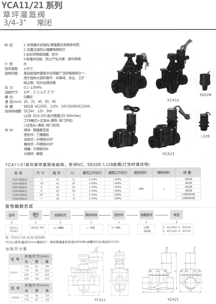 YCA1125GLN,YCA1140GLN,YCA1150GLN,YCA1180GLN,YCA2120GLN,YCA2125GLN,草坪灌溉閥