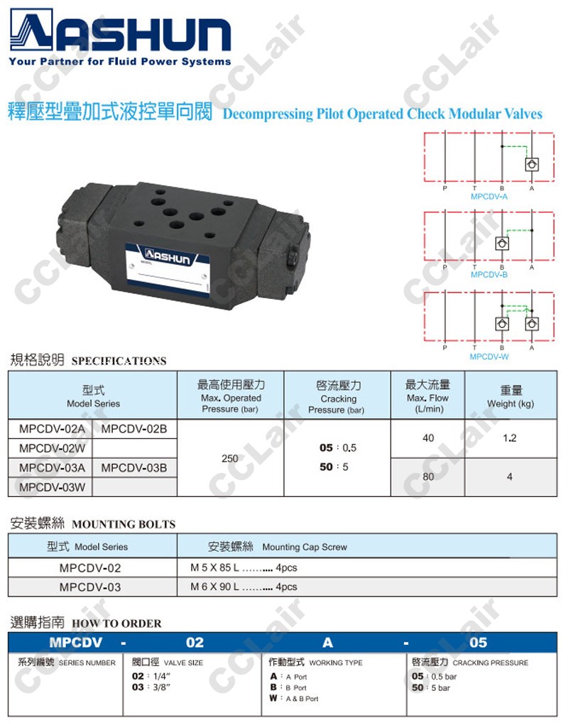 MPCDV-02A,MPCDV-02B,MPCDV-02W,MPCDV-03A,MPCDV-03B,MPCDV-03W,MPCDV-03W-50,ASHUN油順疊加式液控單向閥