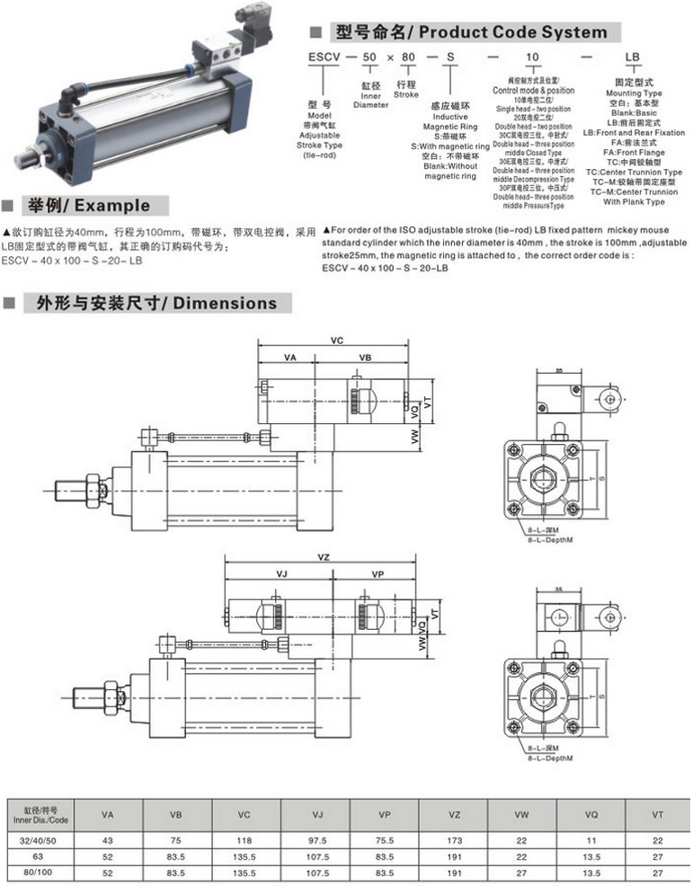 詳細信息 ESCV-32*80-S,ESCV-40*80-S,ESCV-50*100-S,ESCV-63*100-S,標準氣缸