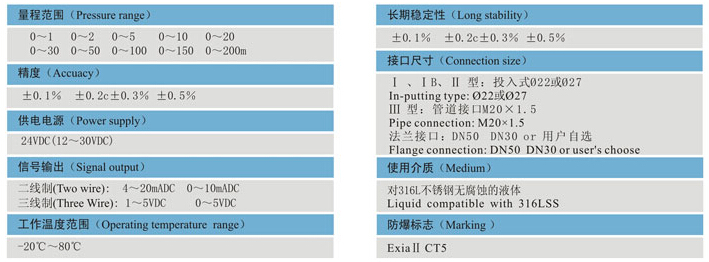 YD322-II液位變送器由全密封隔離膜充油液位傳感器和儀表專用電路組成,具有測量精度高、穩(wěn)定性好、壽命長、安裝方便等優(yōu)點(diǎn)。采用獨(dú)特的工藝密封結(jié)構(gòu)形式,防滲漏性能好,長期浸入液體中工作可靠。