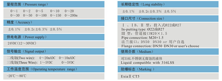 YD322IIC液位變送器由全密封隔離膜充油液位傳感器和儀表專用電路組成,具有測(cè)量精度高、穩(wěn)定性好、壽命長(zhǎng)、安裝方便等優(yōu)點(diǎn)。采用獨(dú)特的工藝密封結(jié)構(gòu)形式,防滲漏性能好,長(zhǎng)期浸入液體中工作可靠。