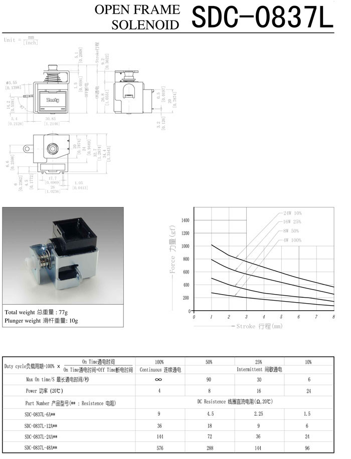 詳細信息 SDC-0837L-06A,SDC-0837L-12A,SDC-0837L-24A,SDC-0837L-48A,直動電磁鐵