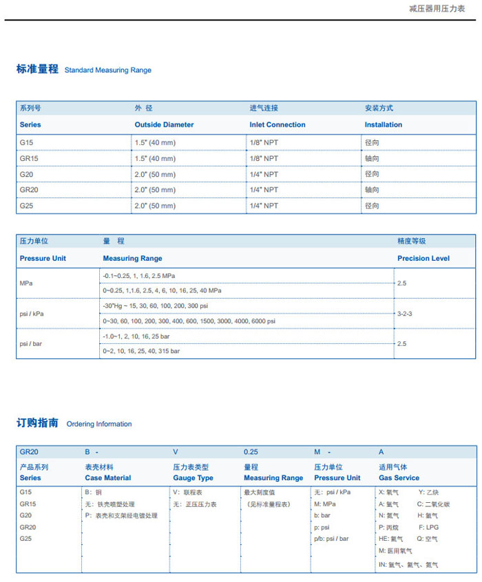 G15,GR15,G20,GR20,G25,G15B-V0.25M,GR15B-V2.5M,G20P-2.5M,GR20P-2.5M,G25P-2.5M,減壓器用壓力表 |
