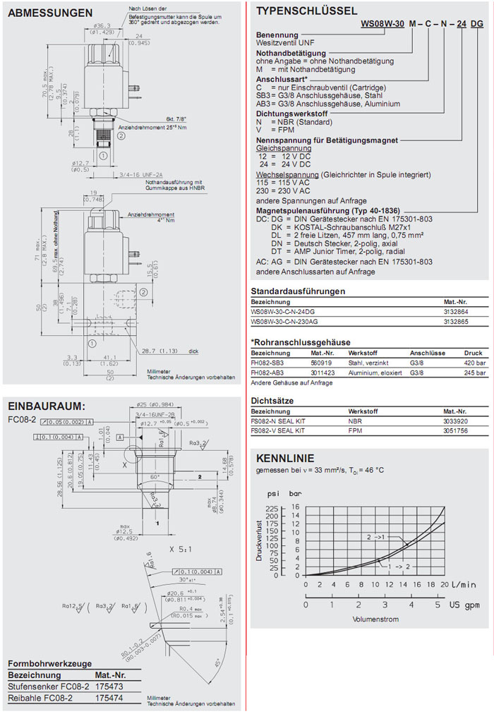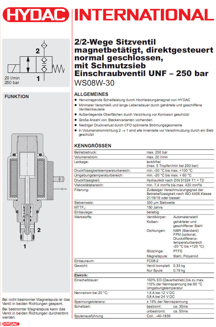 WS08W-30-C-N-24DG,WS08W-30-C-N-230AG,HYDAC電磁2/2方向座閥