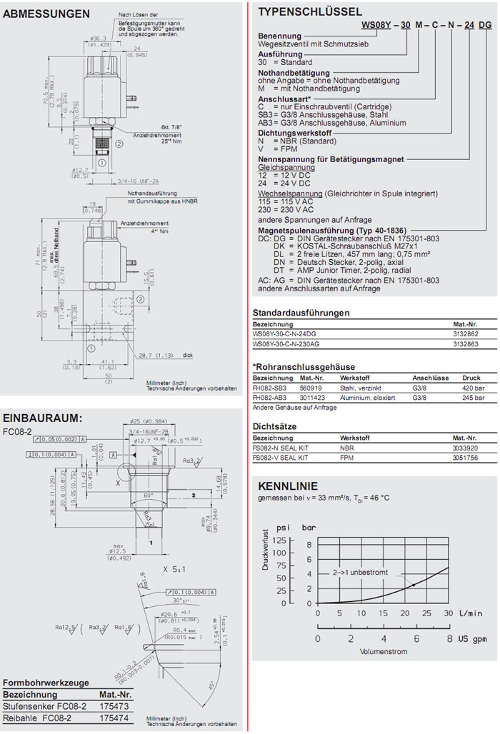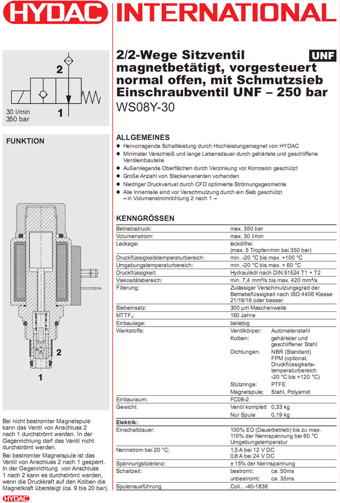 WS08Y-30-C-N-24DG,WS08Y-30-C-N-230AG,HYDAC電磁2/2方向座閥