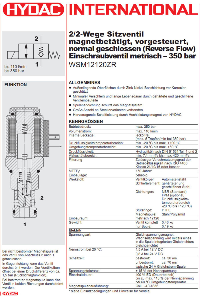 WSM12120ZR-01-C-N-12DG,WSM12120ZR-01-C-N-24DG,WSM12120ZR-01-C-N-230AG,HYDAC電磁2/2方向座閥 |