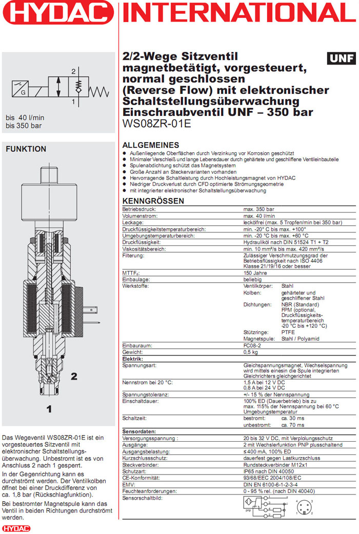 WS08ZR-01E-C-N-12DG,WS08ZR-01E-C-N-24DG,WS08ZR-01E-C-N-230AG,HYDAC電磁2/2方向座閥 |