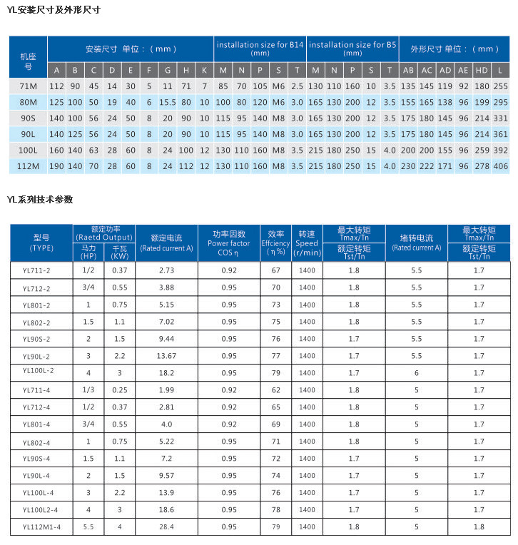 YL90S-2,YL90L-2,YL100L-2,YL711-4,YL712-4,YL801-4,YL802-4,YL112M-4,