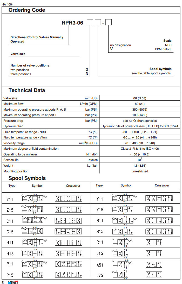 RPR3-062,RPR3-063,RPR3-062Z11,RPR3-063J75,RPR3-062J15,RPR3-063Y11,RPR3-062J75,ARGO手動方向控制閥