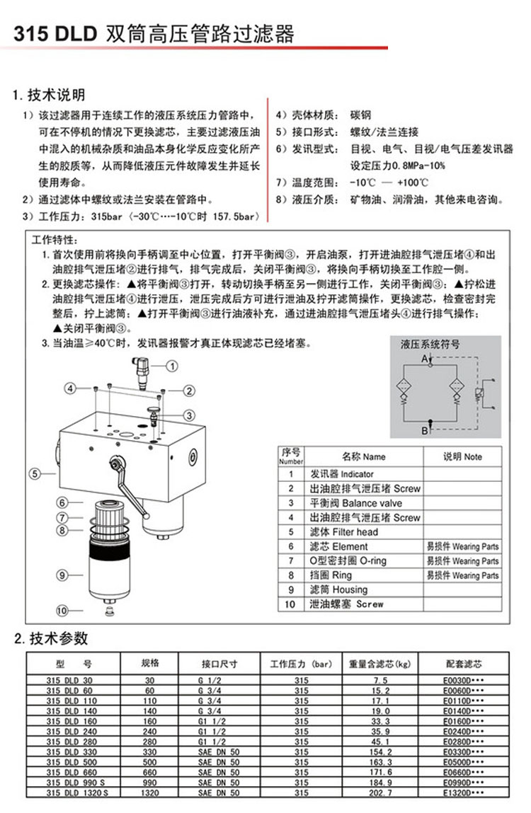 315DLD280,315DLD330,315DLD500,315DLD660,315DLD990S,315DLD1320S,315DLD280FKN3,雙筒高壓管路過濾器