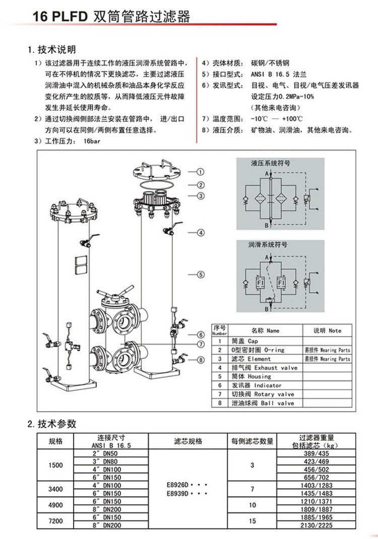 16PLFD15,16PLFD34,16PLFD49,16PLFD72,16PLFD15S2602KN3,16PLFD34S2604KN3,16PLFD72S2606KN3,雙筒管路過(guò)濾器