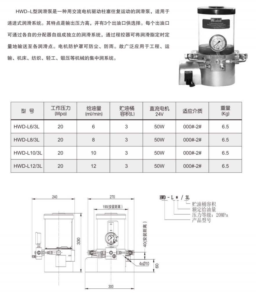 HWD-L6/3L,HWD-L8/3L,HWD-L10/3L,HWD-L12/3L,電動潤滑泵