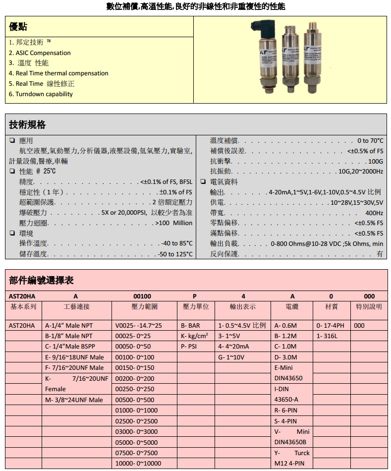 型號: AST20HA-A,AST20HA-B,AST20HA-C,AST20HA-E,AST20HA-F,AST20HA-K,壓力傳感器