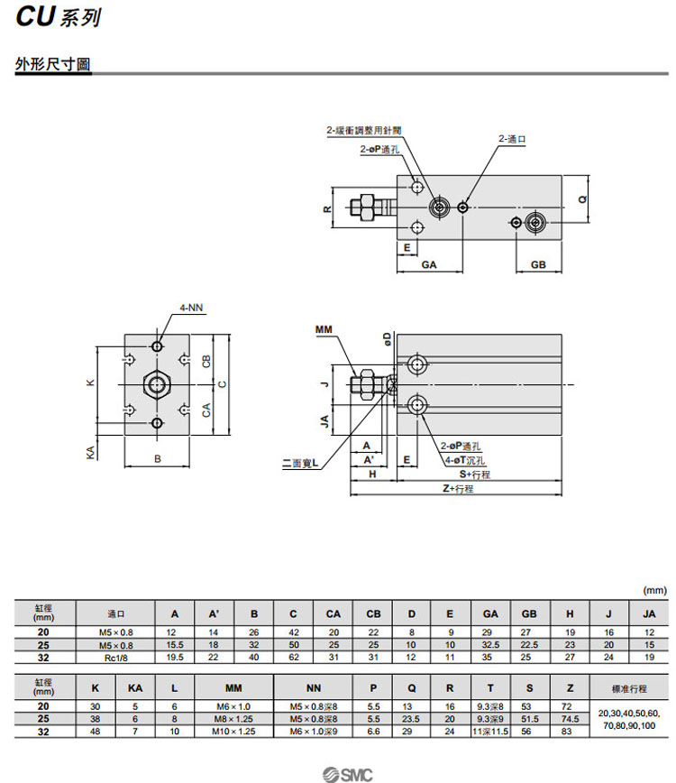 CU20-20A,CU25-20A,CU32-20A,CDU20-20A,CDU25-20A,CDU32-20A,CU32TN-20A,CDU32TF-20A,SMC自由安裝型氣缸