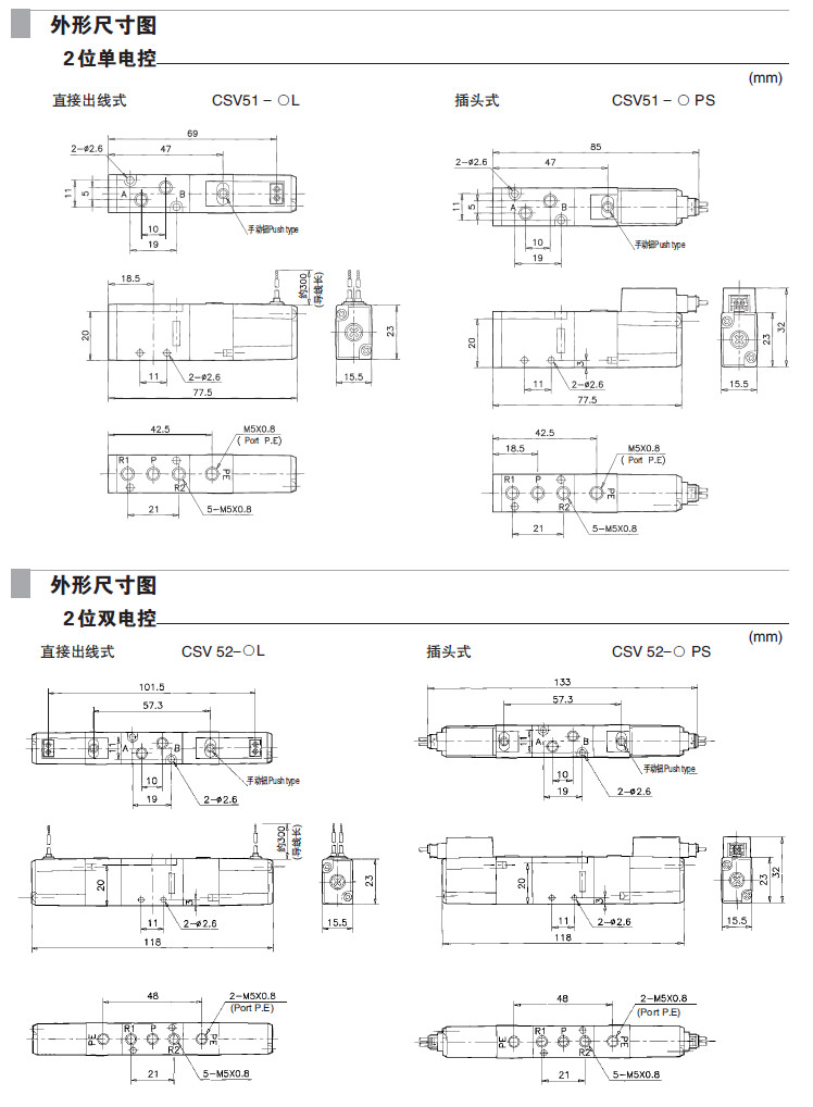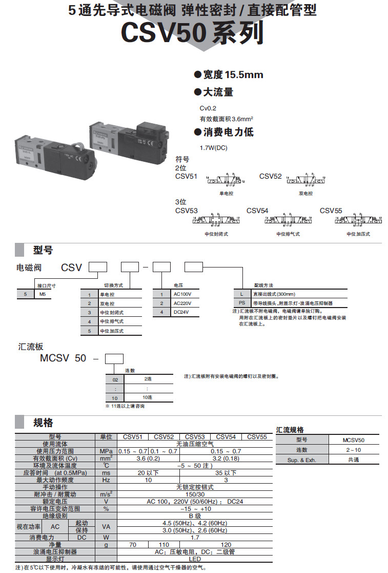 CSV51-1L,CSV52-2L,CSV53-4L,CSV54-1PS,CSV55-2PS,CSV51-4PS,5通先導式電磁閥