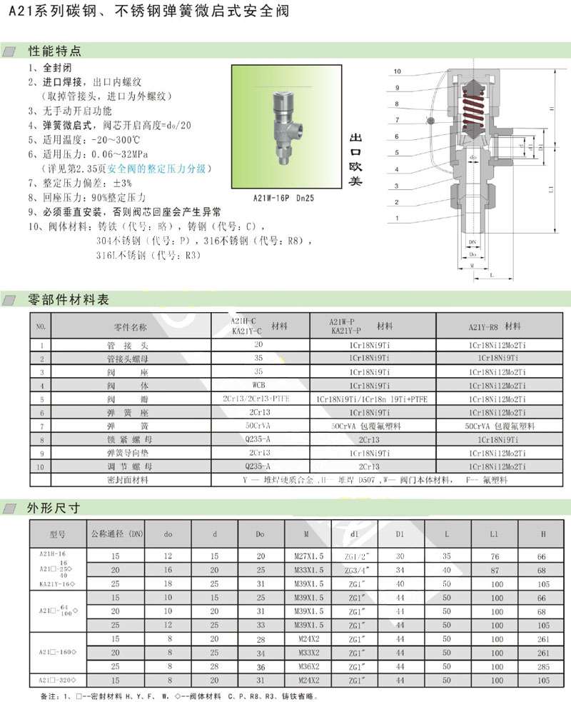 A21H-16C,A21W-16C,A21Y-40C,KA21Y-16C,KA21Y-100P,微啟式安全閥