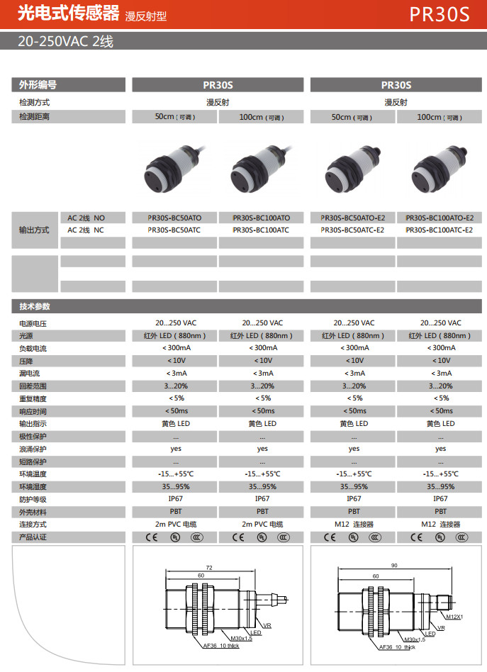 PR30S-BC50ATO,PR30S-BC50ATC,PR30S-BC50ATO-E2,PR30S-BC50ATC-E2,PR30S-BC100ATO,光電式傳感器 |