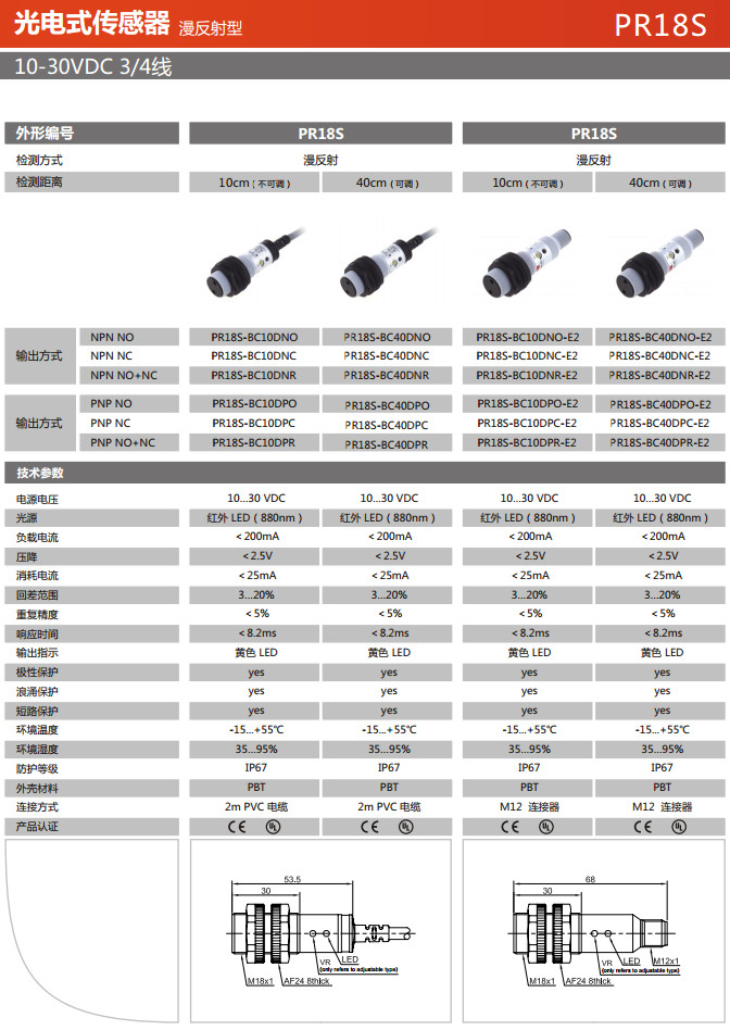 PR18S-BC10DNO,PR18S-BC10DNC,PR18S-BC10DNR,PR18S-BC10DPO-E2,PR18S-BC10DPC-E2,光電式傳感器