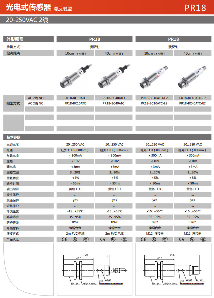PR18-BC10ATO,PR18-BC10ATC,PR18-BC40ATO,PR18-BC40ATC,PR18-BC10ATO-E2,光電式傳感器 |