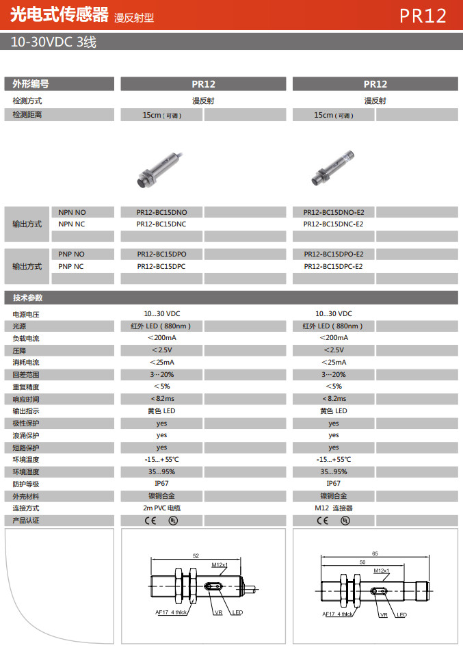 PR12-BC15DNO,PR12-BC15DNC,PR12-BC15DPO,PR12-BC15DPC,PR12-BC15DNO-E2,PR12-BC15DNC-E2,光電式傳感器 |
