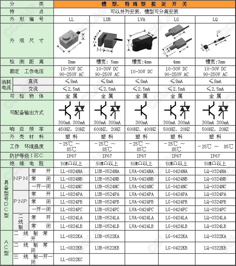 LL-0824NA,LUB-0524NA,LVA-0424NA,LG-0424NA,LQ-0324NA,LL-0824NB,LUB-0524NB,LVA-0424NB,槽型、特殊型接近開關 |