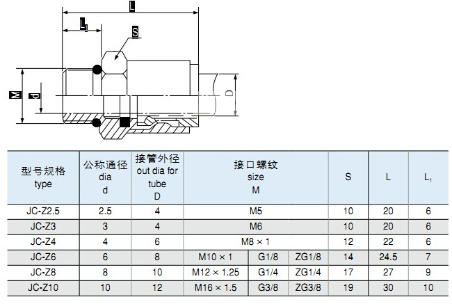 JC-Z2.5,JC-Z3,JC-Z4,JC-Z6,JC-Z8,JC-Z10,插入式直通終端管接頭