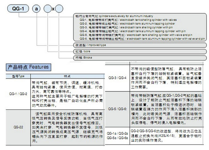 QG系列鋁行業(yè)專用氣缸分為六個品種QG-1~QG-6,針對鋁廠電解槽打殼和出鋁的不同需要,可酌情選用。
