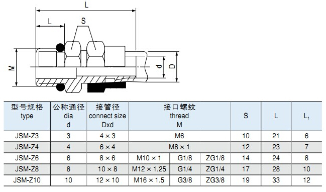 JSM-Z3,JSM-Z4,JSM-Z6,JSM-Z8,JSM-Z10,鎖母式直通終端管接頭