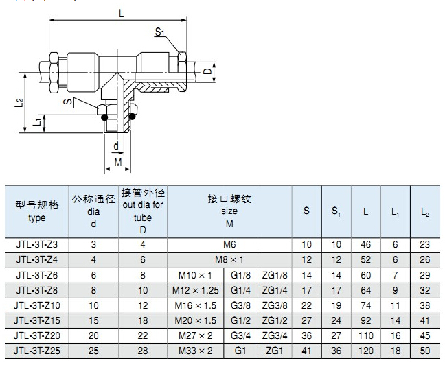 JTL-3T-Z3,JTL-3T-Z4,JTL-3T-Z6,JTL-3T-Z8,JTL-3T-Z10,JTL-3T-Z15,JTL-3T-Z20,JTL-3T-Z25,卡套式三通終端管接頭