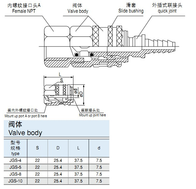 型號規(guī)格說明,下圖例JGS-W-6A(JGS-K-6B)插入式外螺紋接口。高性能快速接頭,外插式內(nèi)螺紋接口。