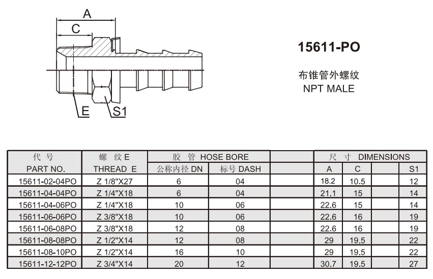 15611-02-04PO,15611-04-04PO,15611-06-06PO,15611-08-08PO,15611-12-12PO,插入式軟管接頭