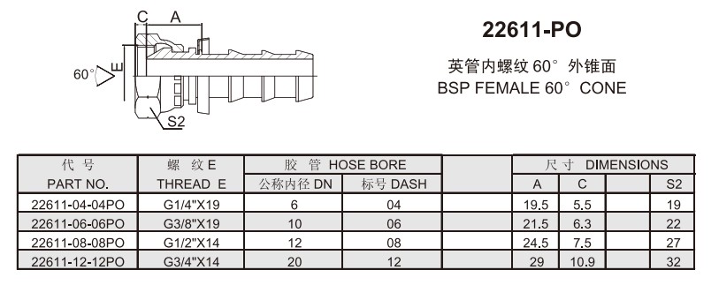 22611-04-04PO,22611-06-06PO,22611-08-08PO,22611-12-12PO,插入式軟管接頭