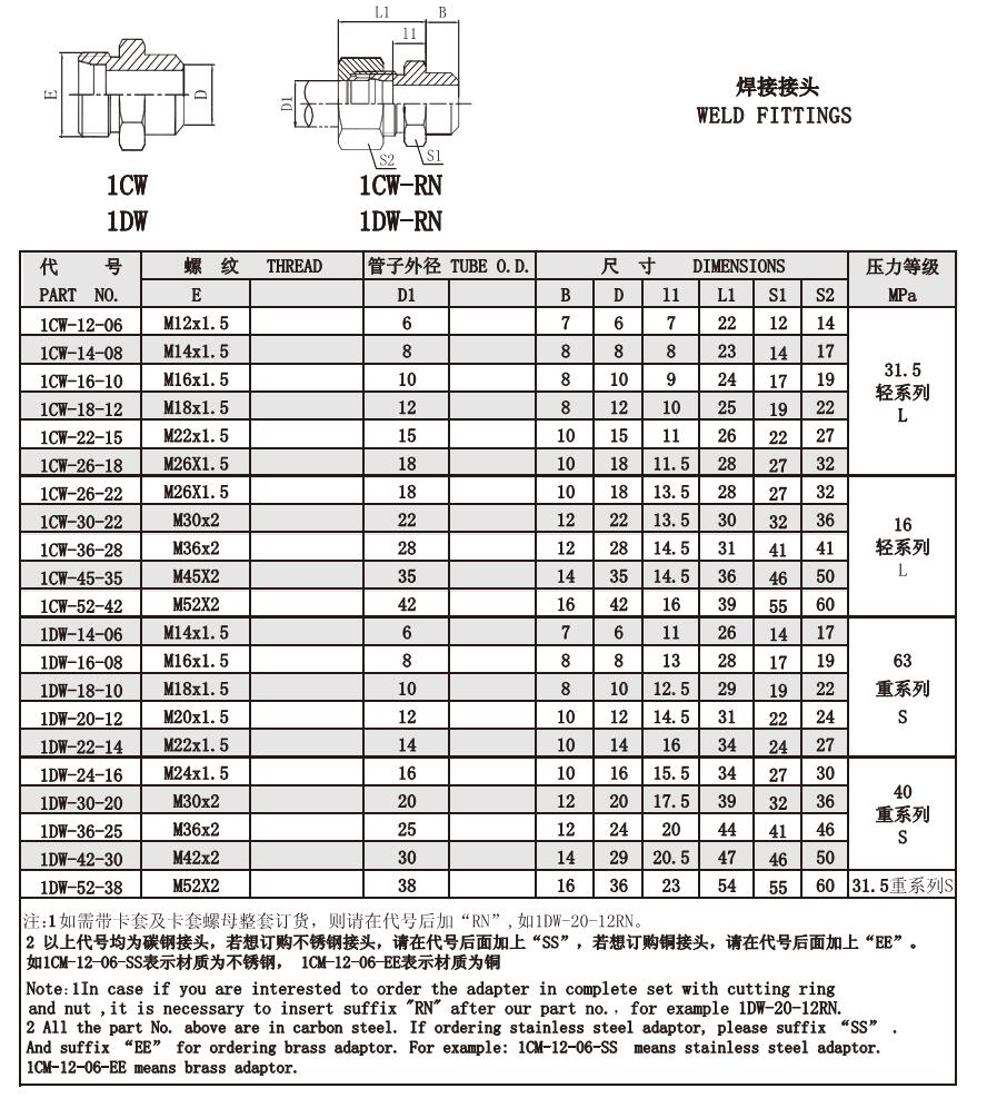 1CW-12-06,1CW-14-08,1CW-16-10,1CW-18-12,1DW-20-12,1DW-22-14,1DW-24-16,1DW-30-20,焊接接頭