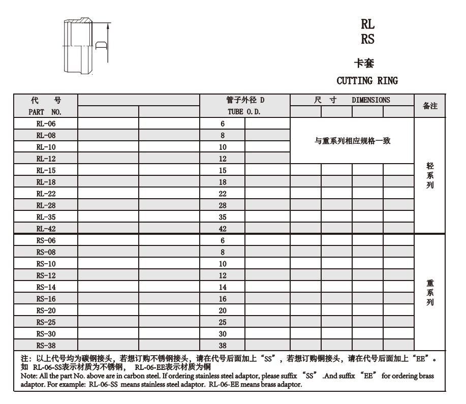 RL-06,RL-08,RL-10,RL-12,RS-16,RS-20,RS-25,RS-30,RS-38,公制螺紋卡套接頭