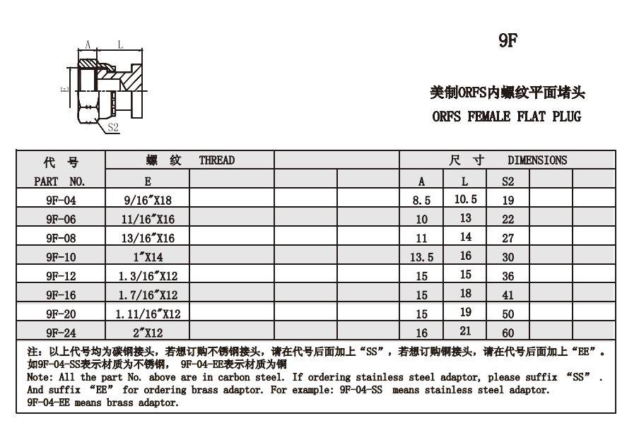 9F-04,9F-06,9F-08,9F-10,9F-12,9F-16,9F-20,9F-24,內(nèi)螺紋平面堵頭