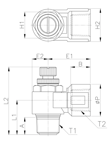 | Model | ∅P | T1 | A | T2 | B | L1 | L2/MIN | L2/MAX | E1 | E2 | H1(Hex) | H2(Hex) | WEIGHT(g) | EA(BOX) |
