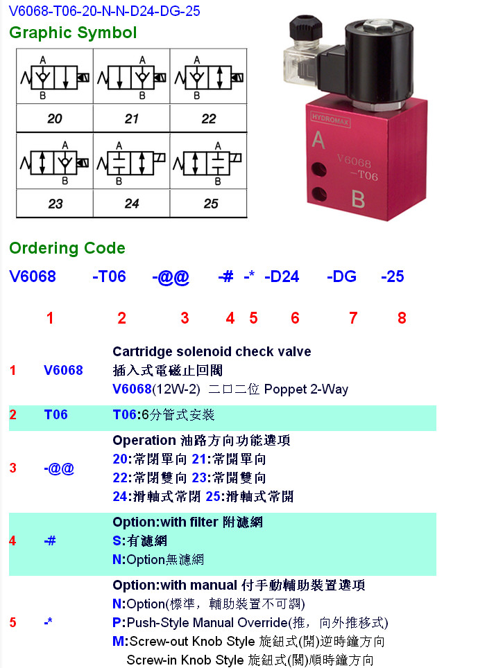 V6068-T06-21,V6068-T06-22,V6068-T06-23,V6068-T06-24,V6068-T06-20-N-N-D24-DG-25,HYDROMAX插入式電磁止回閥