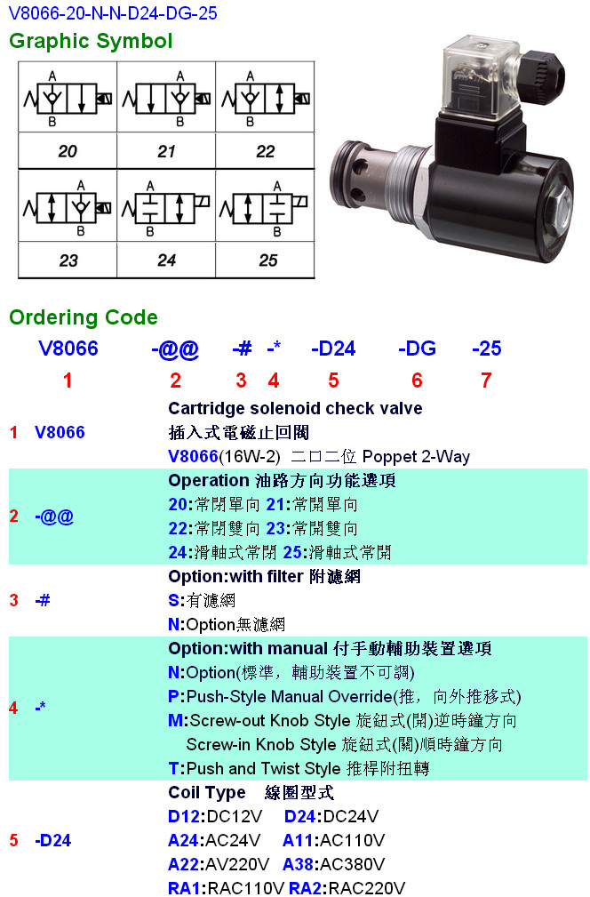 V8066-21,V8066-22,V8066-23,V8066-24,V8066-25,V8066-20-N-N-D24-DG-25,HYDROMAX插入式電磁止回閥