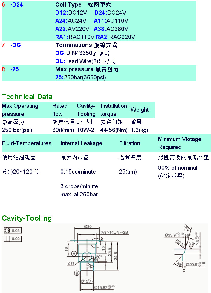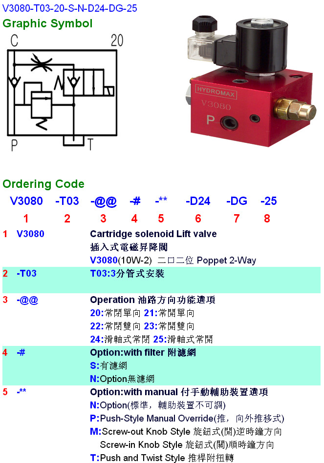 V3080-T03-21,V3080-T03-22,V3080-T03-23,V3080-T03-24,V3080-T03-20-S-N-D24-DG-25,HYDROMAX插入式電磁升降閥