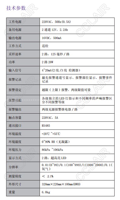 兩級報警值設定,不同聲光信號指示不同報警級別