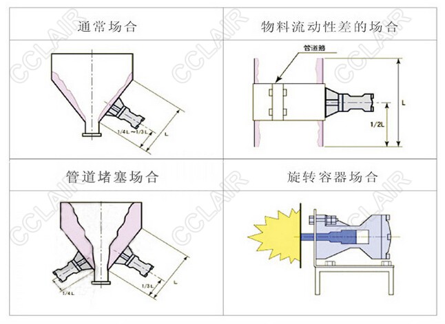 ◎通過壓縮空氣為動力,瞬間釋放,推動內(nèi)部的錘頭打擊底部,將強(qiáng)力沖力傳遞給料斗壁面,有效地?fù)羝莆锪纤鶚?gòu)成的拱橋,使積料松動,達(dá)到卸灰順暢的目的。