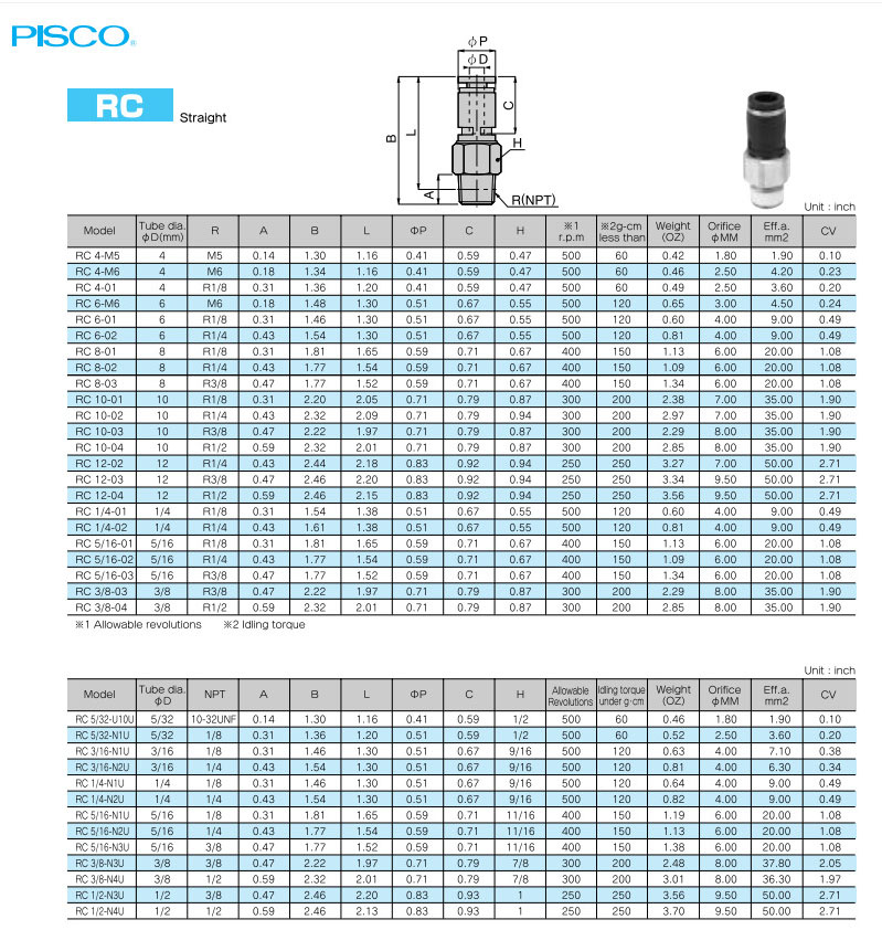 RC4-M5,RC6-M6,RC8-01,RC10-01,RC12-02,RC1/4-01,RC5/16-01,RC3/8-03,PISCO旋轉(zhuǎn)型接頭