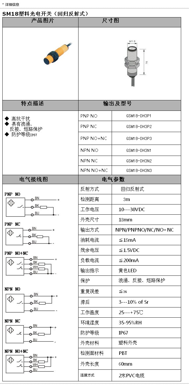 GSM18-DH3P1,GSM18-DH3P2,GSM18-DH3P3,GSM18-DH3N1,GSM18-DH3N3,SM18塑料光電開關(guān)(回歸反射)