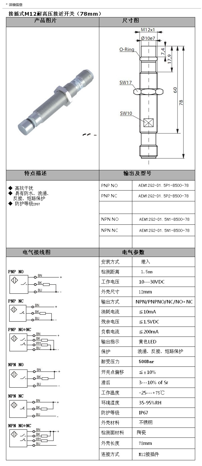 AEM12G2-D1.5P1-B500-78,AEM12G2-D1.5P2-B500-78,AEM12G2-D1.5N1-B500-78,M12接插式(78mm)