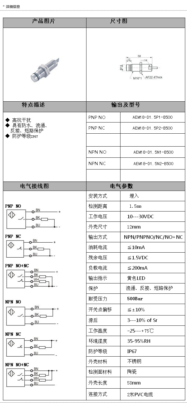 AEM18-D1.5P1-B500,AEM18-D1.5P2-B500,AEM18-D1.5N1-B500,AEM18-D1.5N2-B500,M18耐高壓接近開關(guān)
